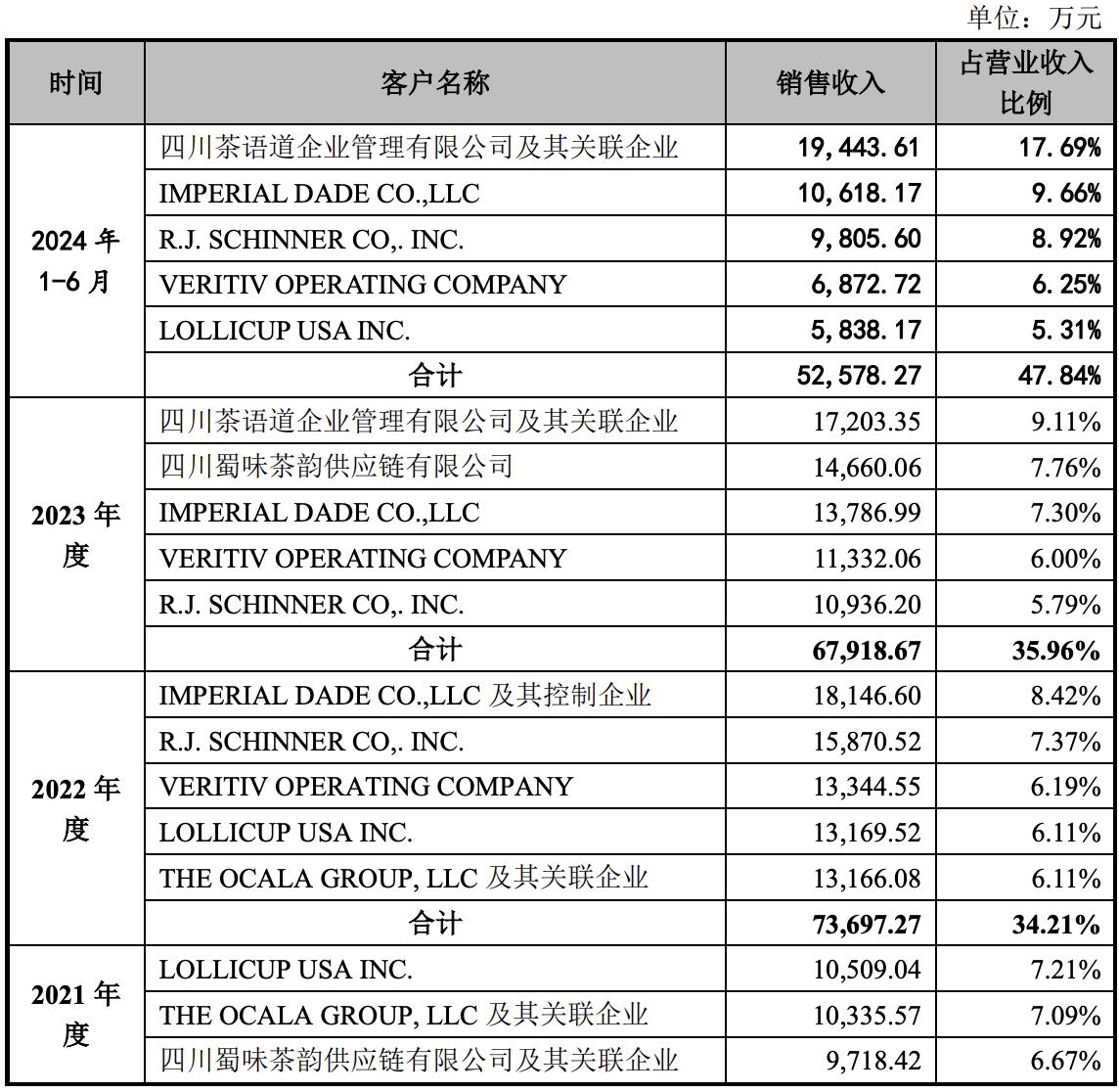 相比之下,茶百道则于2021年度和2023年度进入富岭科技的前五大客户行列。其中,2021年贡献的收入约为9718.42万元、1.47亿元,分别为其第三、第二大客户,占比分别约为6.67%和7.76%。