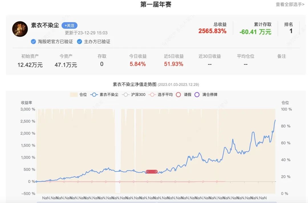 在得知参加实盘赛可以见到职业炒手前辈后,他参加了2023年第一届年赛,全程实盘展示低吸交易也能获得暴利,其交易风格大开大合、彪悍激进,做隔日低吸强势股时,若不符合预期便杀伐果断。最终实现了一年近26倍、两年40倍的惊人成绩,平均仓位高达94.5%近乎满仓,他就是年度总冠军@素衣不染尘。