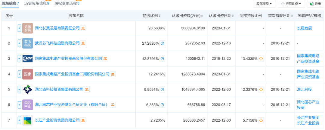 此外,长江存储科技控股有限责任公司的股东还包括国家集成电路基金(俗称“大基金”)的多家成员,其总计持股比例超过50%;以及湖北省国资委旗下的长江产业投资集团有限公司,为单一第七大股东。