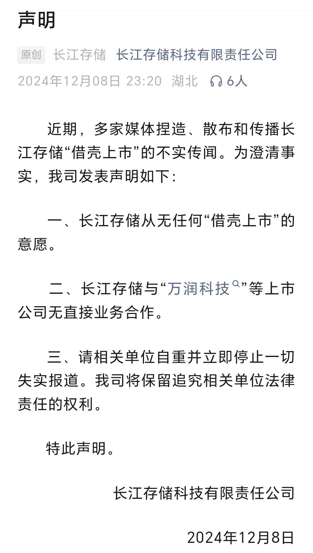 长江存储:从无任何“借壳上市”的意愿 12月8日晚23点20分,在国内存储芯片领域具有举足轻重地位的长江存储科技有限责任公司(以下简称长江存储)在其微信公众号发表声明称: 近期,多家媒体捏造、散布和传播长江存储“借壳上市”的不实传闻。