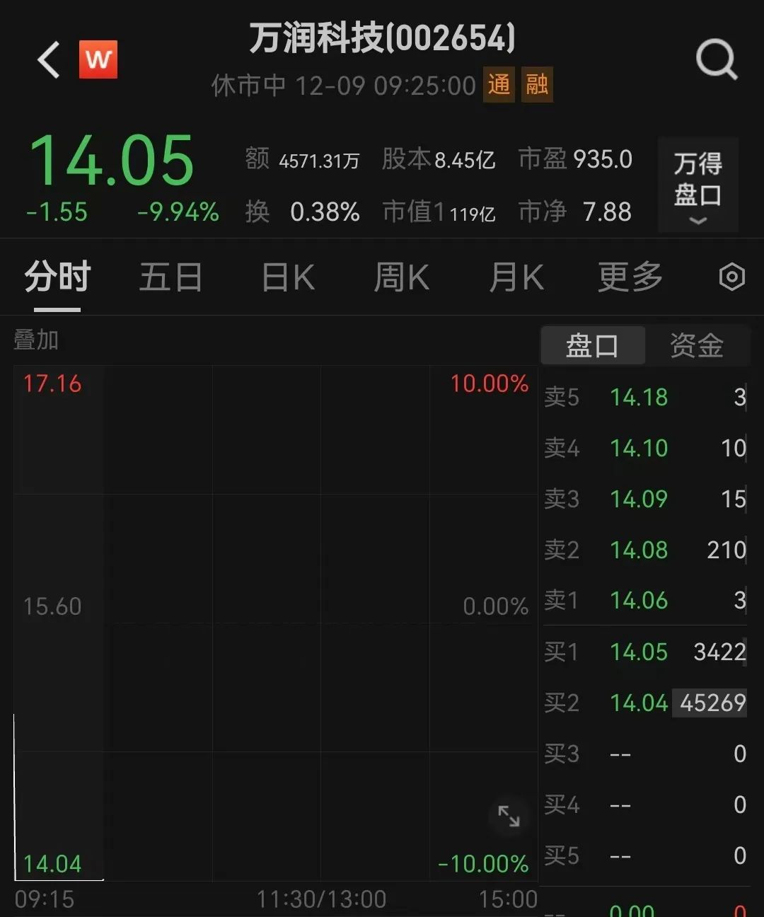 12月9日早盘,万润科技股价在集合竞价时暴跌9.94%。