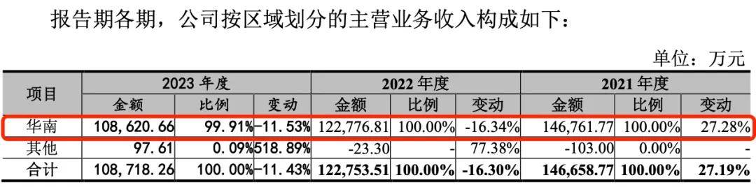 招股书显示,2021年-2023年(以下简称“报告期”),宏业基来自华南地区的收入分别为14.68亿元、12.28亿元和10.86亿元,占比分别为100%、100%和99.91%。其中,公司深圳地区的收入占比在70%以上。