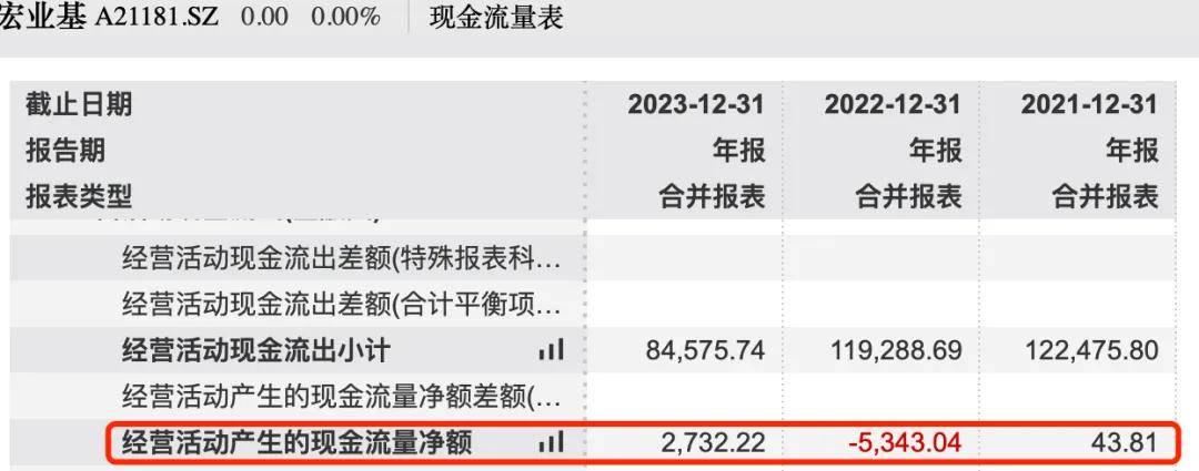 报告期内,宏业基净利润累计2.05亿元。同期,公司经营活动产生的现金流量净额累计为-2567.01万元,二者相差甚远。