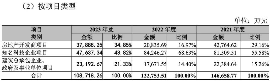 按项目类型分,报告期内,宏业基来自知名科技企业项目的营业收入比例在五成左右,房地产开发商项目则在两到三成。