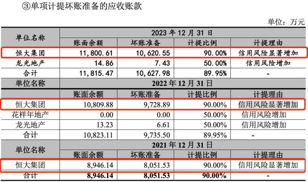 报告期内,宏业基对恒大集团计提的应收账款坏账准备分别为8051.53万元、9728.89万元和1.06亿元,坏账计提比例均为90%。