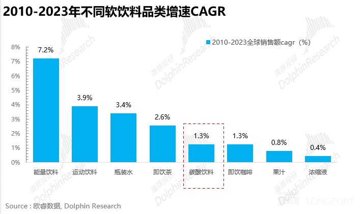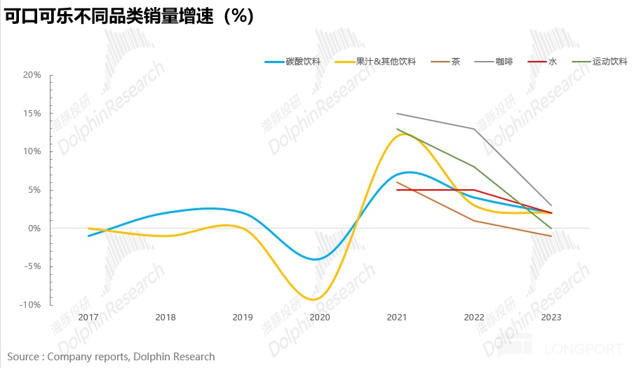 从可口可乐自身品类占比情况看,虽然近年来消费者健康意识觉醒导致碳酸饮料大品类增速有点 “拖后腿”,但仍然贡献了可口可乐 64% 的销量,是公司妥妥的基石业务。在坚守碳酸主业的基础上,公司也及时抓住了非碳酸饮料快速增长的趋势,逐步向全品类软饮转型。从下图可以看出水,运动饮料,即饮咖啡近年来增速较高。