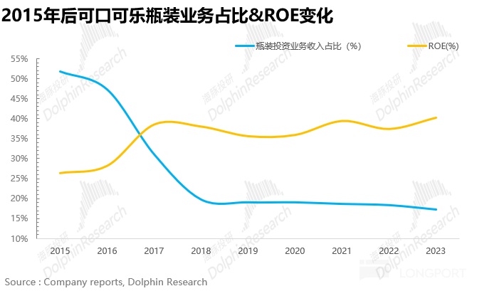 2006 年可口可乐成立瓶装投资部门 BIG(Bottling Investments Group)并继续收购表现不佳的瓶状厂并加以改造,确保其持续输出高质量产品。此阶段公司通过加强对瓶装厂的控制转为重资产运营模式,生产、销售流程得到优化,运营效率提升,但是大规模投资瓶装厂也带来个大问题——资本回报率大幅下滑,ROE 从原本的 40% 一路掉到 24% 左右。