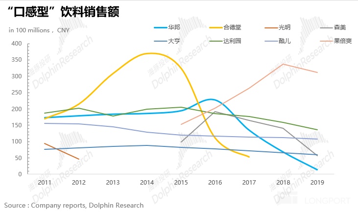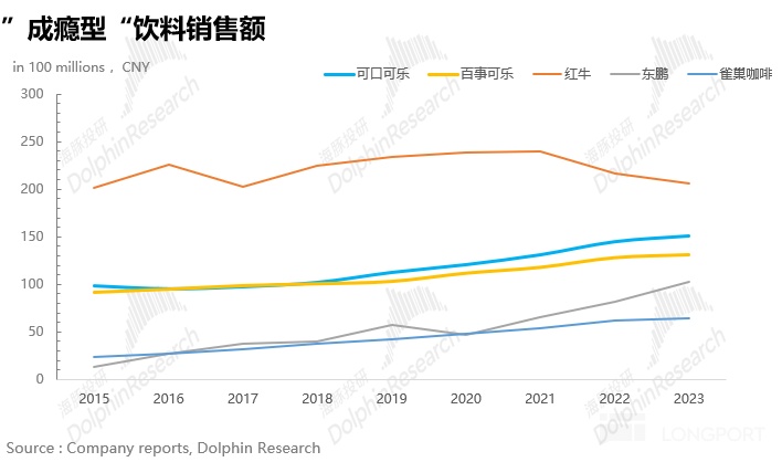 此外,海豚君在研究软饮料品类时发现,带咖啡因、有成瘾性的软饮料,就像自带光环,天生就有爆款潜质,生命周期长不说,还特容易打造出大单品。根据欧睿数据,可口可乐、百事可乐、红牛,单个品牌销售额轻轻松松破百亿;而反观那些果汁品牌,消费者口味飘忽不定,忠诚度低得可怜,能有超 5 亿销售额的单品都屈指可数,生命周期也是转瞬即逝。(这里就拿中国市场销售情况举例)
