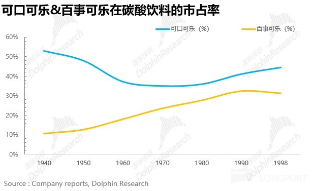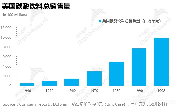 这一番操作下来,不仅公司在碳酸饮料的市占率止跌回升,还顺带拉动了整个美国碳酸饮料市场一路扩张,1950 - 1998 年这 50 年间,销量足足增长近 10 倍。