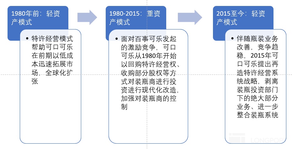 1980-2015 年:逐步收回特许经营权,成立瓶装投资部门。1980 年,面对百事可乐的激烈竞争,为了对生产、销售环节有更强的掌控力,提升战斗力,可口可乐开始收购整合小型装瓶商,形成战略装瓶商。