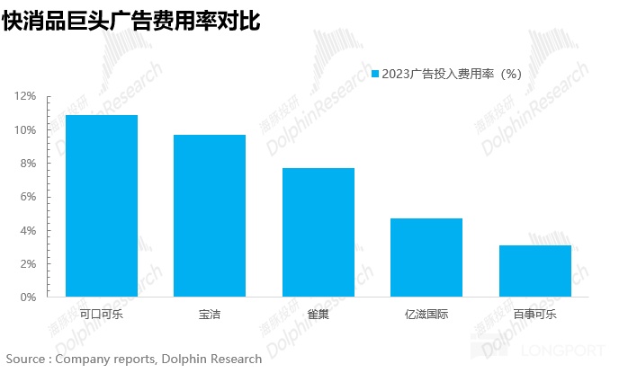 1)高举高打,重品牌,强营销。可口可乐打成立那天起,在营销上就没低调过,一直是高举高打。复盘近些年广告投入,除了 2020 年疫情突袭,不得已削减了广告投放,其余年份那都是 “大手笔”,广告投入轻轻松松超 40 亿美元,广告费用率超 10%,跟百事可乐、其他快消品公司一比,简直就是 “财大气粗”。