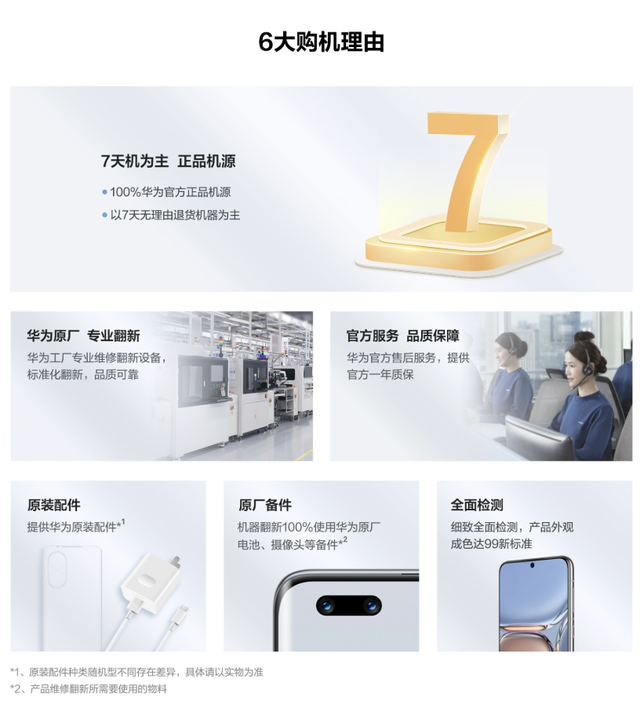 同时,华为官方翻新机提供原装配件(数据线、充电器等),支持7天无理由退货和15天质量问题换货,体验上与新机无异。