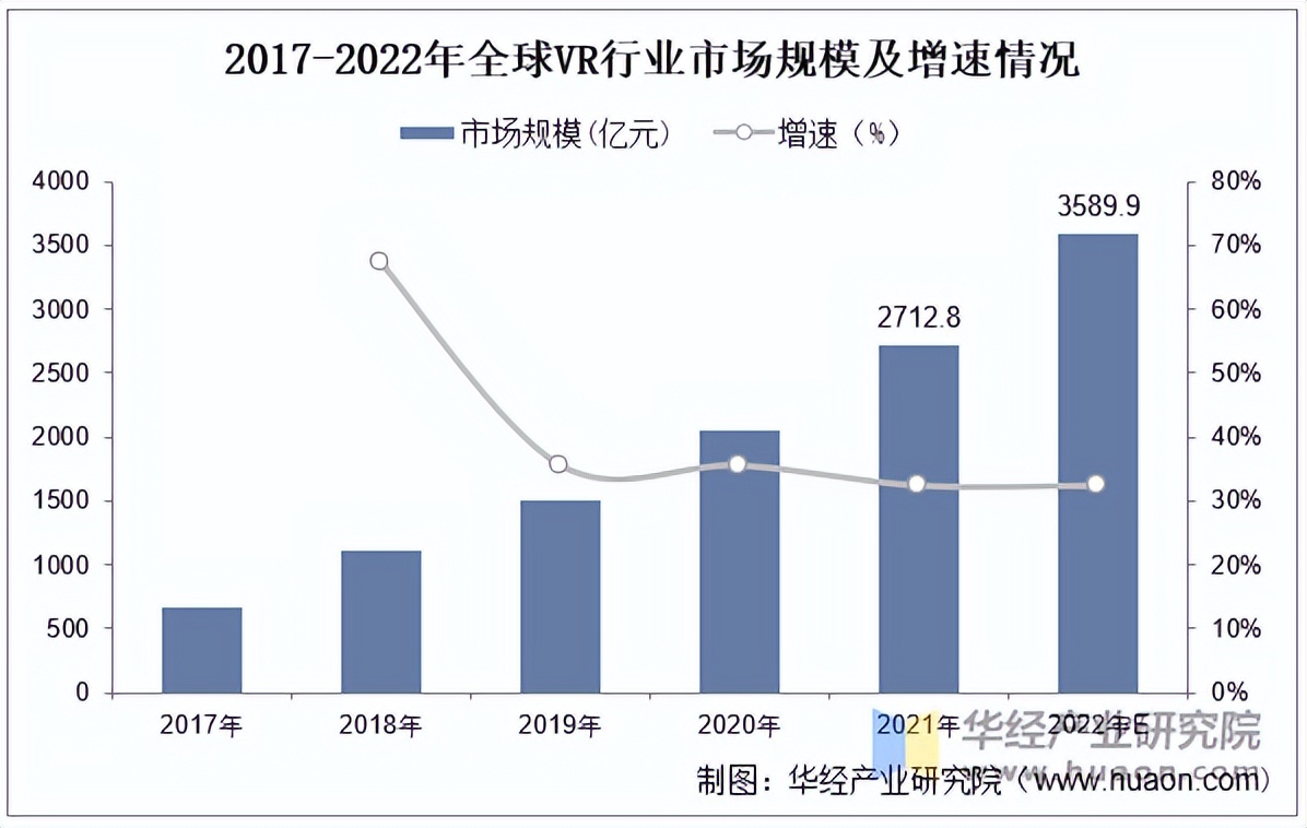 随着技术的成熟,虚拟(增强)现实产业应用在生活的各个领域,为各行业赋能,应用场景需求不断增长,全球虚拟(增强)现实产业市场规模逐年攀升,从2017年的667.5亿元增长至2021年的2712.8亿元,增长幅度306.4%,复合增长率为42%,2021年同比增长32.33%,预计截至到2022年市场规模将达到3589.9亿元。