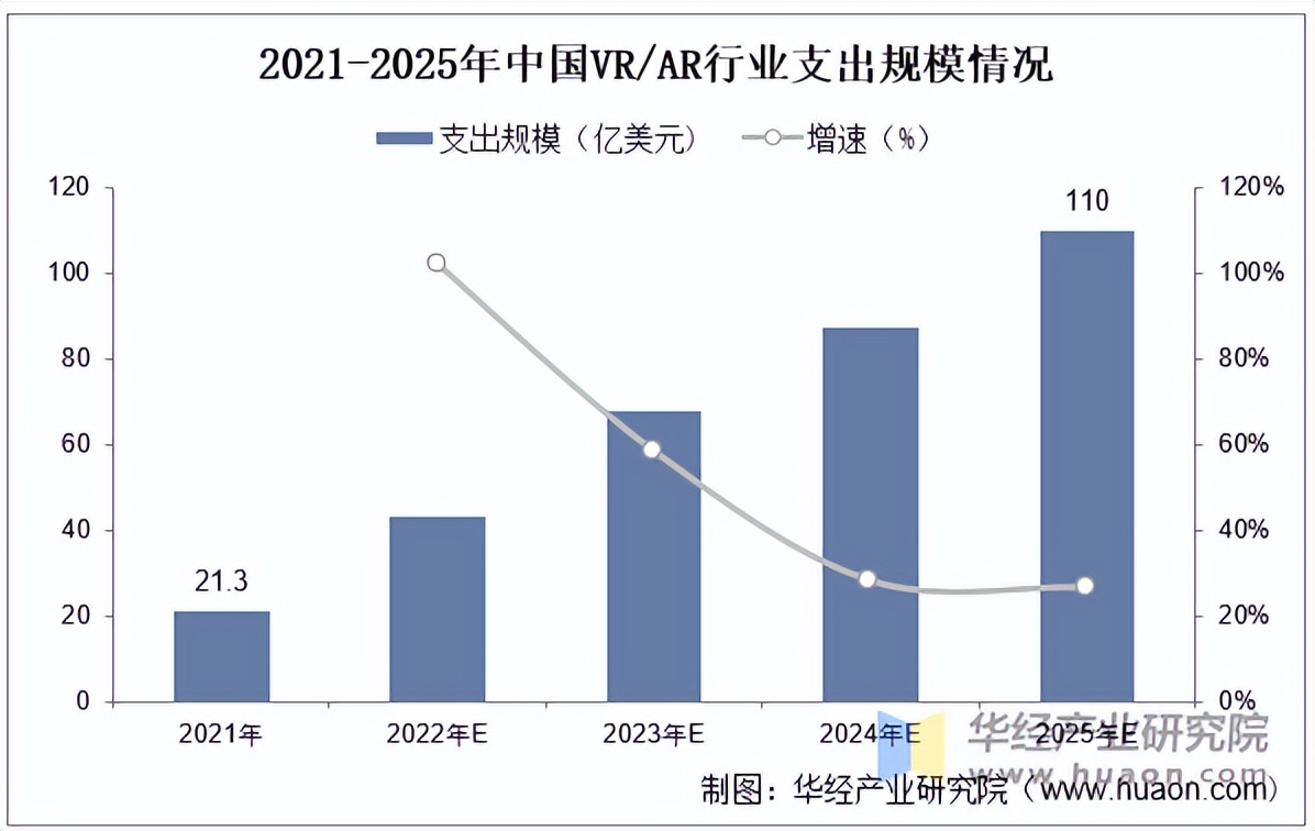 2021年随着头部互联网公司入局,中国AR/VR市场被注入了巨大活力,发展前景广阔。2021年中国AR/VR市场IT相关支出规模约为21.3亿美元,并将在2025年增至110亿美元,为全球第二大单一国家市场。其中,AR支出规模将以49.0%的五年CAGR快速增长,VR支出规模以41.5%的五年CAGR保持稳定增长。