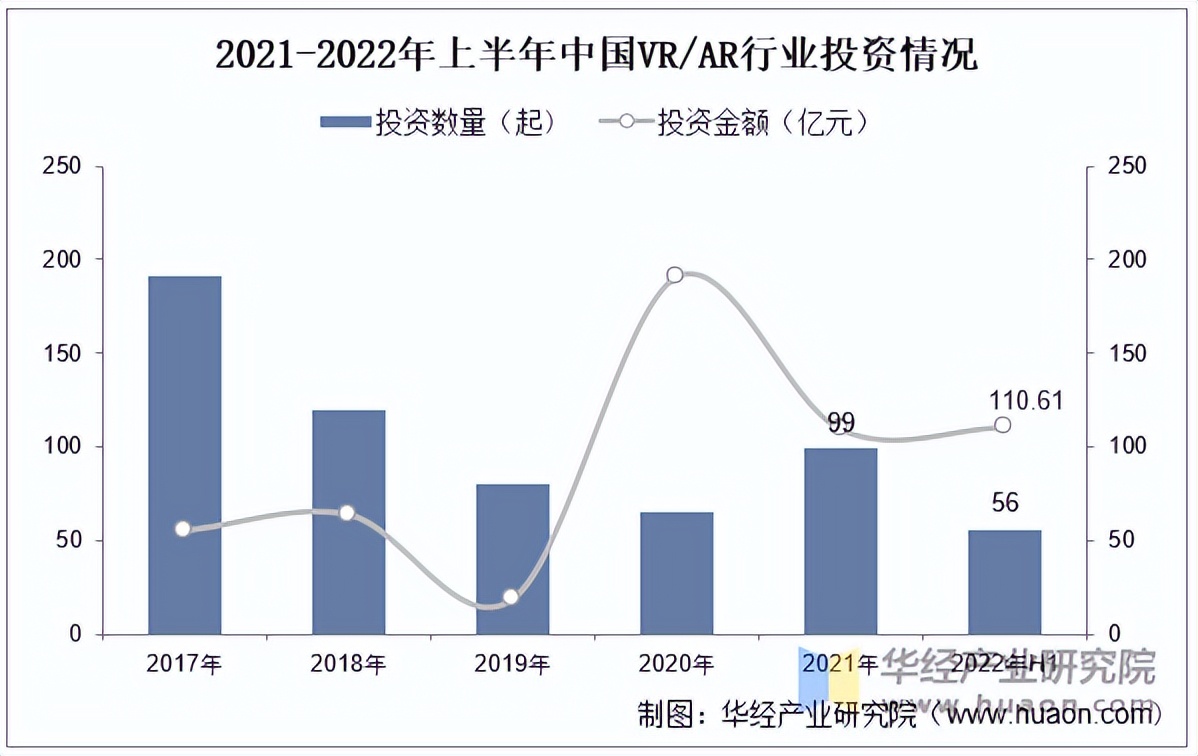 2017年至2021年VR/AR行业投资事件从191起逐渐减少至99起,投资金额从55.60亿元大幅增加至109.36亿元。2022年上半年投资事件56起,同比增加55.56%;投资金额为110.61亿元,同比减少78.88%。