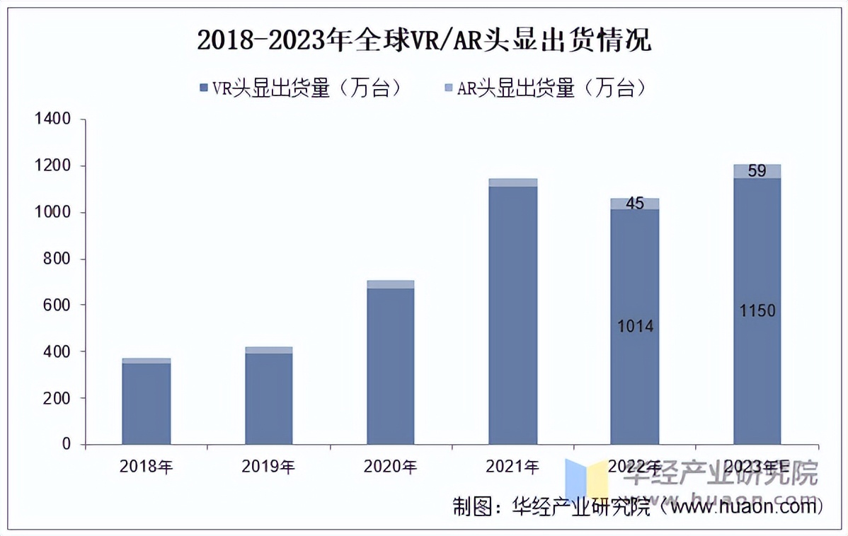 据统计,2022年VR终端出货量(不包含VR眼镜盒子)为1014万台,较2021年下滑了8.65%,预计2023年全球VR出货量将达到1150万台。AR头显出货量较低,截至2022年出货量为45万台,预计2023年将达到59万台。