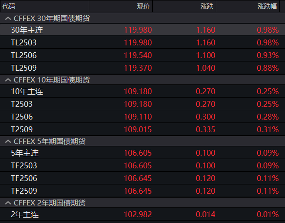 截至收盘,国债期货收盘集体上涨,30年期主力合约涨0.98%,10年期主力合约涨0.25%,5年期主力合约涨0.09%,2年期主力合约涨0.01%。