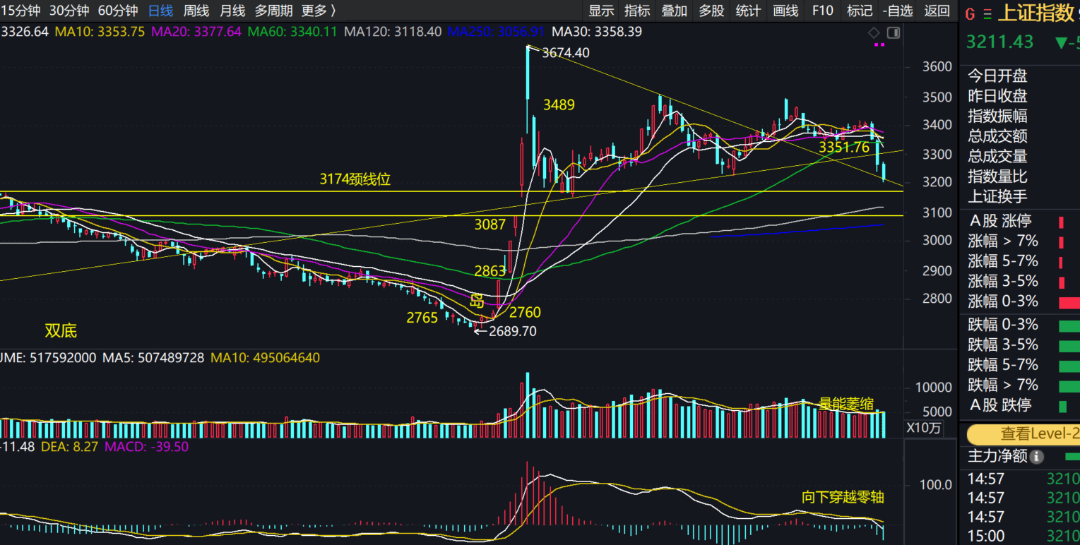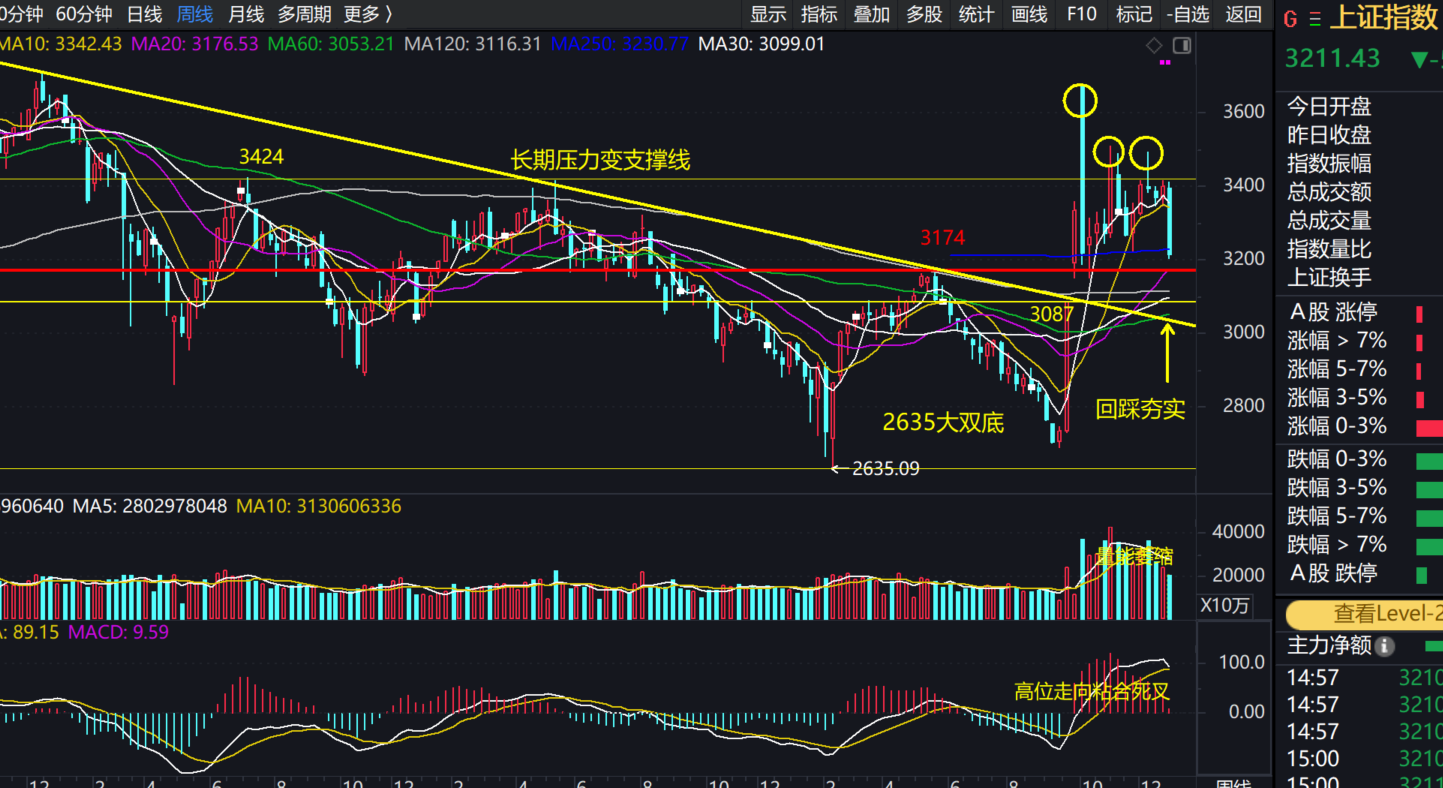 这里股海有必要再次说明一下前面帖子陆续提到的3174点一带的颈线位,为什么界定为大约“上下100点”?首先上下百分之三左右,就是一百点左右;其次,9月30日形成的巨大日周双料缺口的下沿就在3087点;再次,3708点、3418点、3174点的原长期压力线被9月30日之后放量突破后,就演变成了长期支撑线,该支撑线当前向下动态延申到了3050点一带。因此股海认为,2635点以来的时空跨度巨大的双底的颈线位一带,就应该有足够的范围。也就是说,弥补3087点缺口、回踩动态250日年线是有可能有机率的,都应该看成是巨型双底的颈线位的回踩夯实。