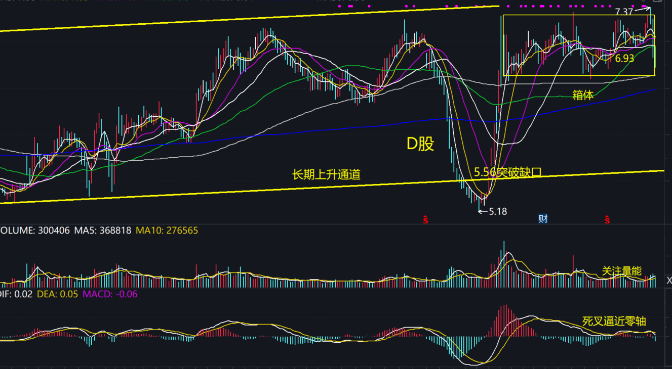D股,本周股价开盘7.22元,最高7.37元。最低6.73元,收盘6.76元,全周收一巨阴线,成交量明显放大。本周股价的走势大幅弱于股海的预期,虽如期弥补了6.93元日线缺口,然而其大幅震荡的的范围,从上沿到下沿,几乎贯穿了整个大约0.8元宽度的中期箱体。股价一举跌破了短中期均线,出现了考验中期箱体下沿6.6元一带的迹象,动态均线系统面临粘合死叉、DIFDEA死叉逼近零轴。