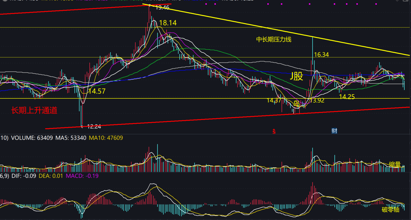 短期下周,预计股价将继续震荡下跌,破前期低点14.25元,考验下方14元整数关口及13.92元缺口支撑。不可盲目杀跌,提防探底反弹。下周股价运行主区间大约:14.6元到13.9元之间。个人满仓满融持股为主,伺机高抛低吸滚动操作。