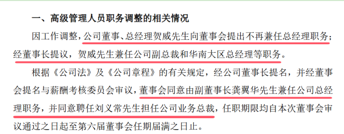 公开资料显示,龚翼华在2013年1月至2020年11月期间就担任过公司总经理。此后,刘义常在2020年11月至2022年4月担任公司总经理,此前其职务为业务总裁。贺威担任总经理其实是在刘义常之后。