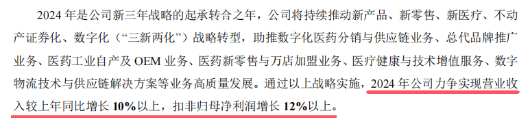 2024年年初,九州通曾定下“营收较上年同比增长10%以上,扣非净利润增长12%以上”的目标。不知道公司制定这个目标时,是否考虑到流感、疫情等因素导致2023年业绩基数较高?