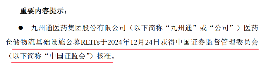 几天前的12月25日,九州通(600998.SH)发布公告称,其医药仓储物流基础设施公募REITs项目已获得中国证监会核准。