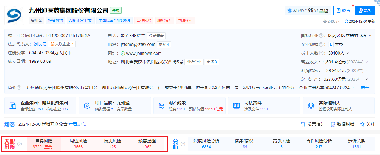 不过,公司面对的风险还是不容小觑。据天眼查显示,九州通自身风险高达6700余条,周边风险也超过3600条。