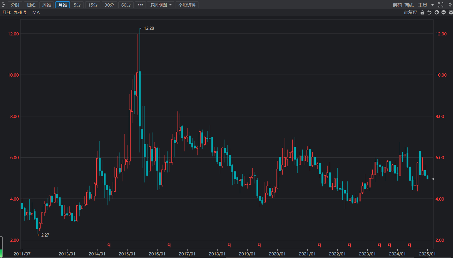 受多种因素影响,在二级市场上,九州通股价长期处于低位震荡中,截至2025年1月3日收盘,九州通股价距离历史高点已缩水六成。