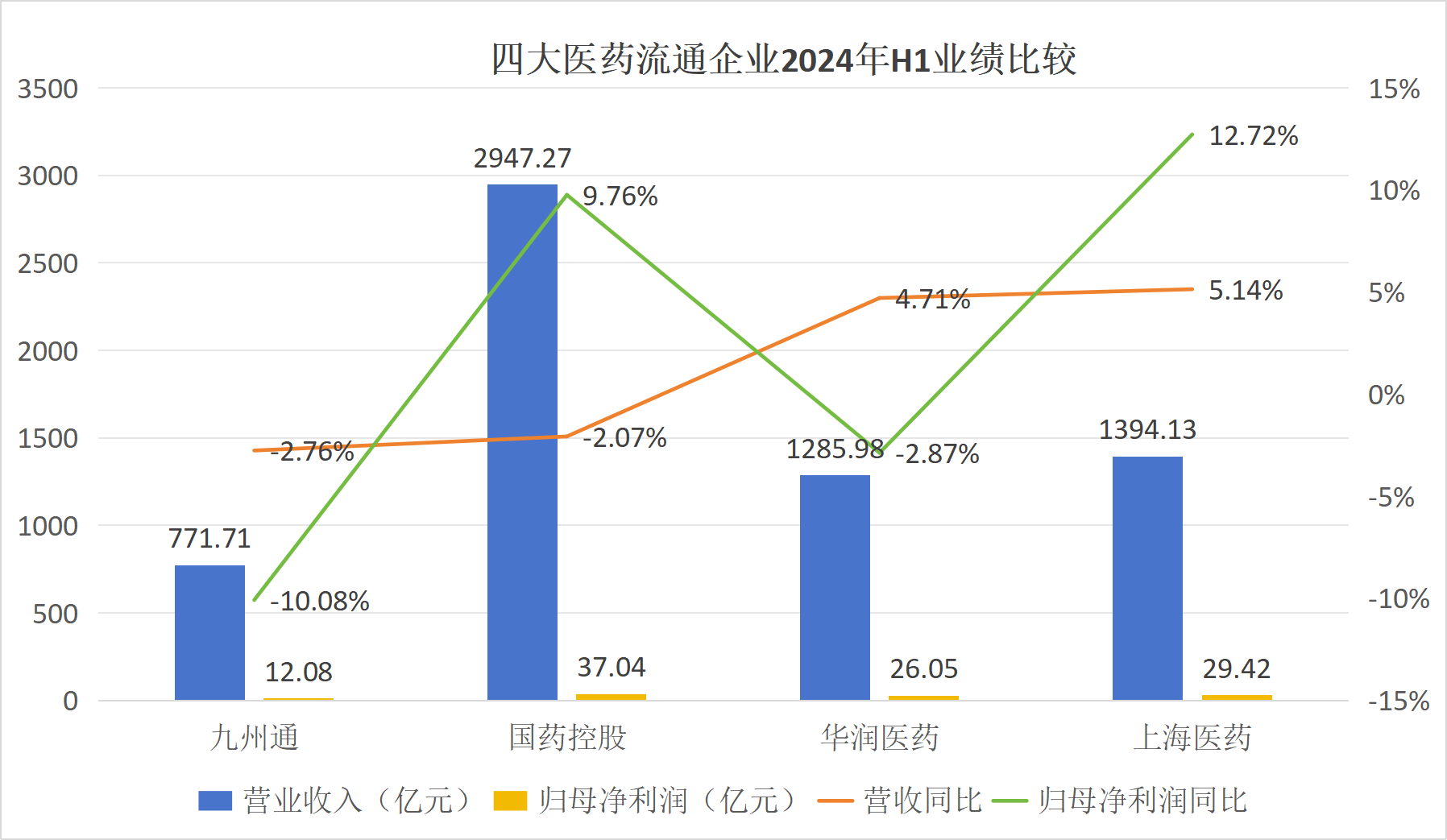 话虽如此,与其它三家医药流通企业巨头相比较,更能看出九州通所面临的业绩压力。