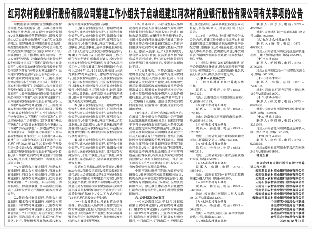 13家机构分别为蒙自农村商业银行、弥勒农村商业银行、建水农村商业银行、石屏农村商业银行、河口农村商业银行、元阳农村商业银行、绿春农村商业银行、红河县农村商业银行、个旧市联社、开远市联社、泸西县联社、屏边县联社、金平县联社,这些机构将以新设合并方式组建红河农商银行。 13家机构的所有业务、财产、债权债务及其他各项权利义务,均由红河农商银行承继;股东股份处置上,将采取自愿转换为红河农商银行股份、自愿转让、自愿退股、清退等方式进行。 多地推动农信体系改革 近年来,在监管政策指导下,多地农信体系改革持续推进。 例如,新疆目前成功筹建了4家以地区为单位统一法人农商银行,其中克州农商银行、和田农商银行、喀什农商银行均在2024年内开业。此外,辽宁、海南、浙江、山西、广西、四川等地选择组建省级农商银行或农商联合银行,且方案均已成功落地。 在2024年12月27日发布的《中国金融稳定报告(2024)》中,央行提出,持续深入推进银行业改革。按照市场化、法治化原则,支持各省(区)结合实际情况探索改革模式和路径,推动改制后的省级机构规范履职,指导农村信用社坚守服务当地、服务小微和“三农”、服务城乡居民的定位,优化股权结构,转换经营机制,完善公司治理,增强发展动能,更好地发挥农村金融服务主力军作用。