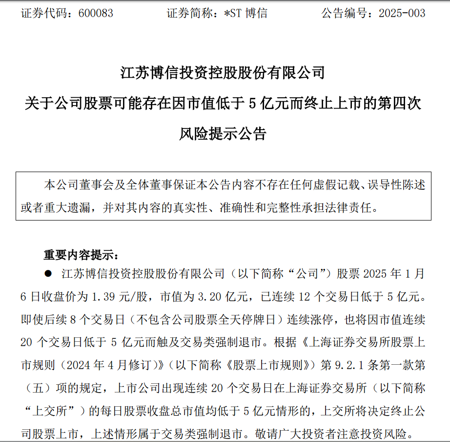 1月6日晚间,*ST博信公告称,公司已连续12个交易日的总市值低于5亿元,即使后续8个交易日连续涨停,也将触及交易类强制退市标准。
