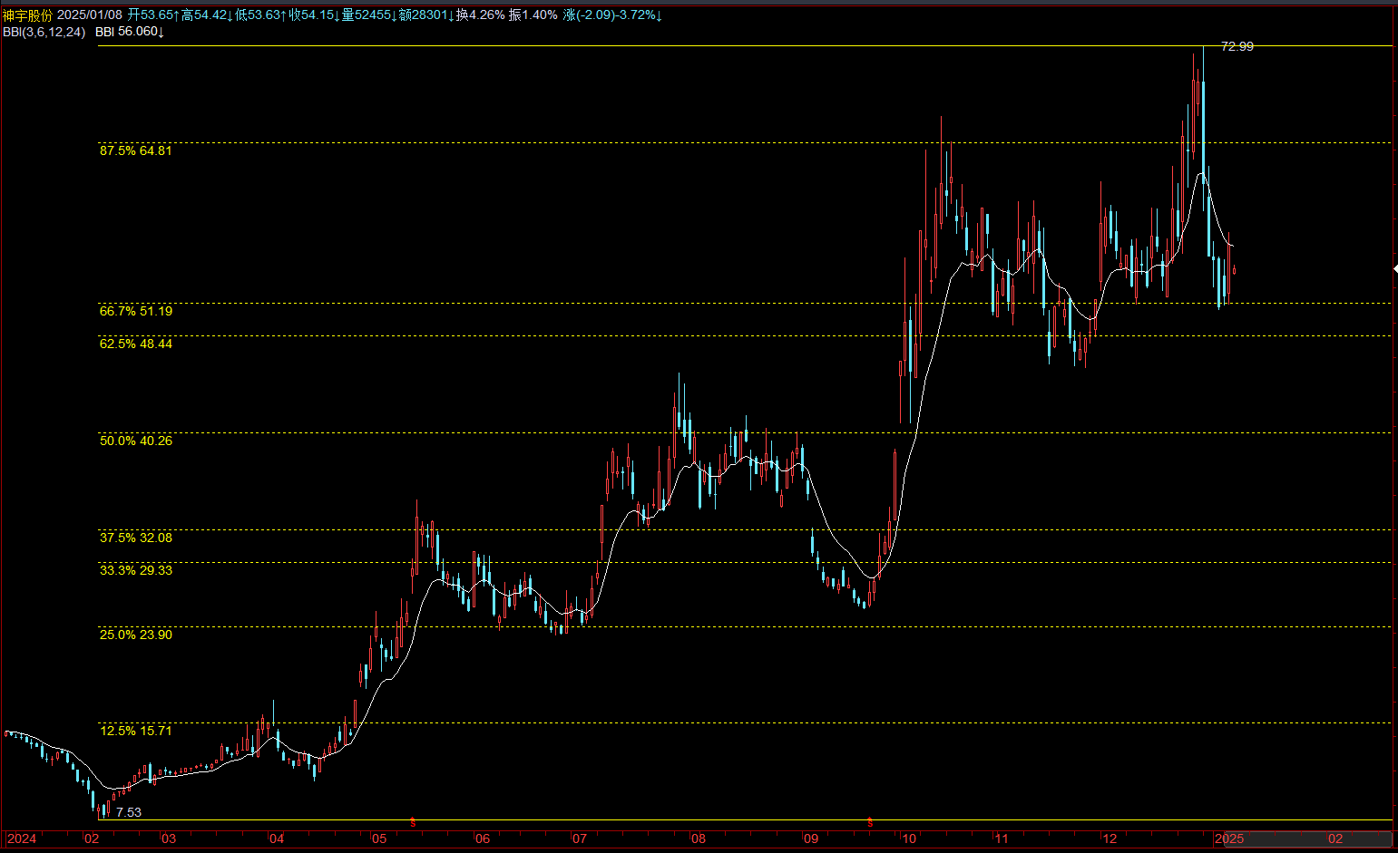 神宇股份,经历一大波上涨之后,创出72.99高点之后,回落。做百分比线,能看出当前刚好是在上三分位有结果支撑,对应价格是51.19。百分比的规则是站稳一线看高一线,突破一线看高一线,一线不过看低一线,破位一线看低一线。按照这个规则来讲,神宇股份的上方空间就是看高一线至875线,即64.81的位置。