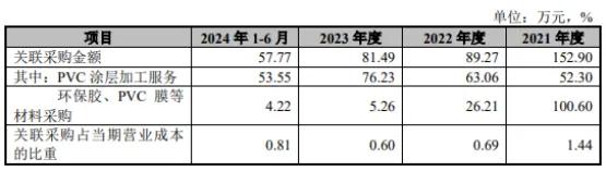 同时,2021年和2022年,宇立新材料为保证其向公司采购特定规格玻纤基布性能的一致性,指定公司向其采购环保胶,双方采购、销售交易相互独立,且自2023年起,公司不再向宇立新材料采购该类环保胶。此外,公司出于日常生产经营中的偶发性需求,向宇立新材料采购零星PVC膜及浆料,报告期内,该类采购金额较小。公司向宇立新材料的关联采购具有商业合理性和必要性,公司对宇立新材料不存在依赖。