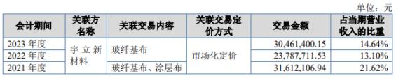 2021年-2023年,公司向宇立新材销售金额分别为3161.21万元、2378.77万元和3046.14万元,占营业收入的比重分别为21.62%、13.10%和14.64%,主要销售的商品为玻纤基布及涂层布。