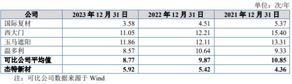 2021年-2023年,杰特新材的应收账款周转率分别为4.36次/年、5.42次/年、5.92次/年,可比公司平均值分别为10.85次/年、9.87次/年、8.77次/年。