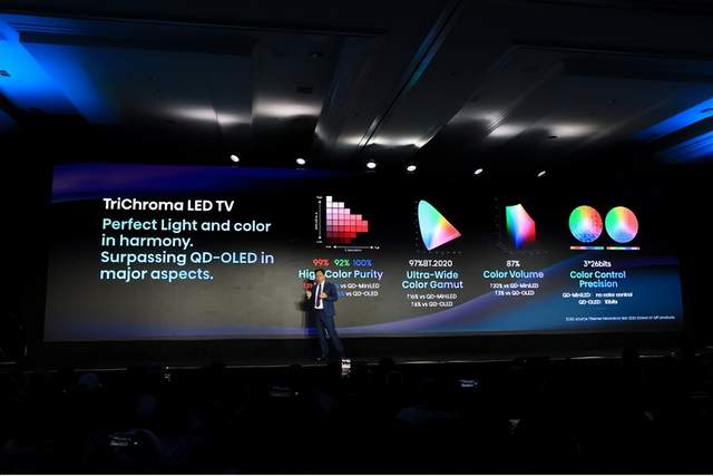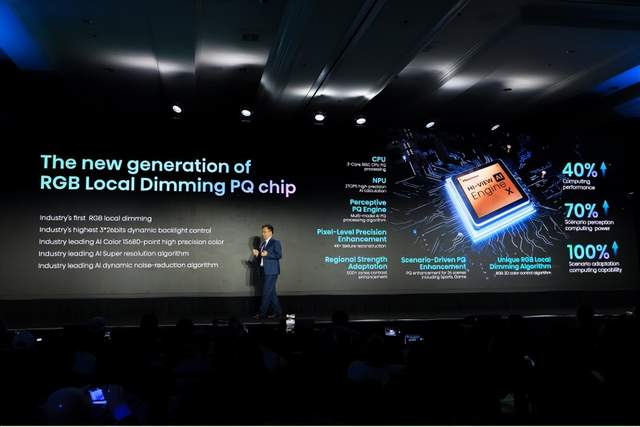 而在展会开幕前,海信先行秀肌肉,举行了显示技术发布会,全球首发RGB三维控色液晶显示技术及全新一代信芯AI画质芯片,并推出全球首台也是最大的116英寸RGB-Mini LED电视,并将于今年3月实现量产上市。