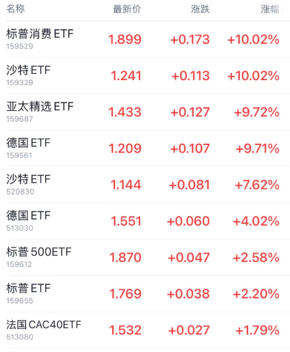 尾盘多只跨境ETF大涨,标普消费ETF(159529)、南方沙特ETF(159329)涨停,另外亚太精选ETF(159687)、嘉实德国ETF(159561)涨超9%,华泰柏瑞沙特ETF(520830)涨超7%,其中标普消费ETF溢价率超50%。