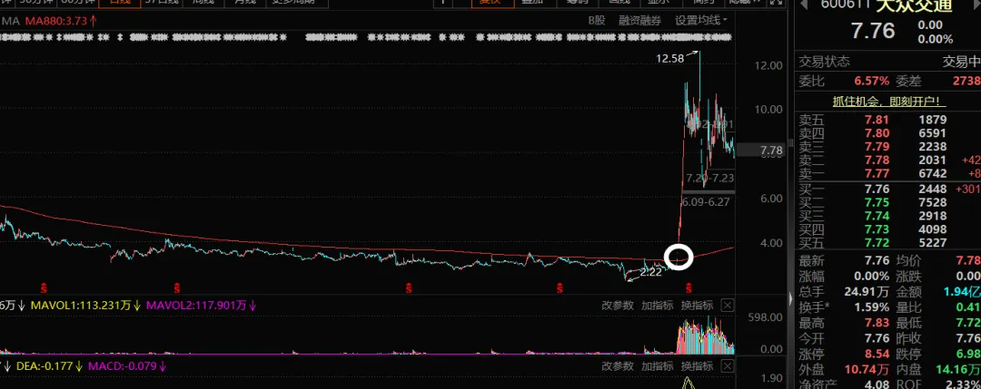 2、另外一种就是880日均线,那种要突破的,或者带量突破的,或者回踩的;比如下面今年的大众交通妖股,涨停放量突破压制了几年的880日均线,注意这种走平的均线很重要~