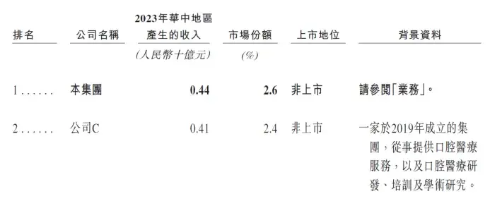 根据弗若斯特沙利文的资料,按2023年所得收入计,大众口腔在华中地区所有民营口腔医疗服务提供商中居第一位,市场份额约为2.6%。与此同时,排名第二的公司C市场份额为2.4%,大众口腔与其并未拉开明显差距。