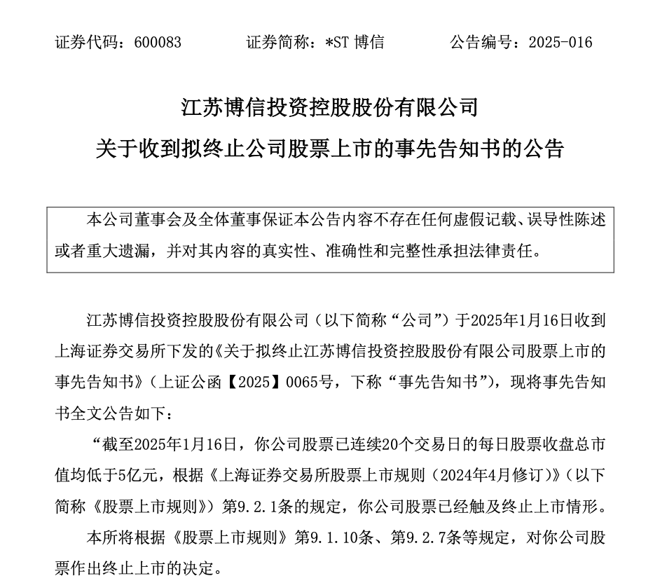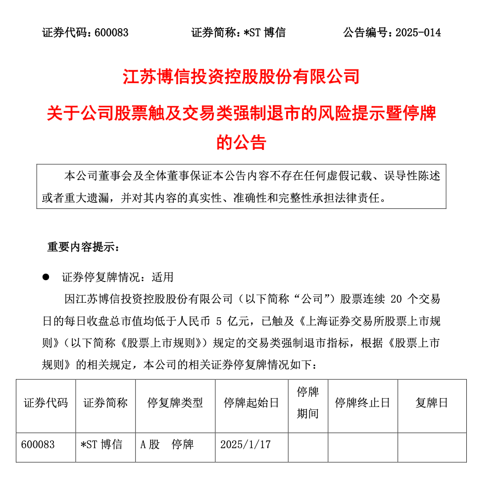 【导读】*ST博信触及退市指标,1月17日起停牌