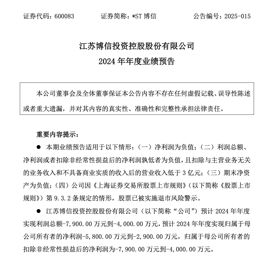 预计2024年亏损金额同比减少 同日发布的业绩预告显示,*ST博信预计2024年净利润为-5800万元至-2900万元,与2023年净亏损2亿元相比,亏损金额有所减少。