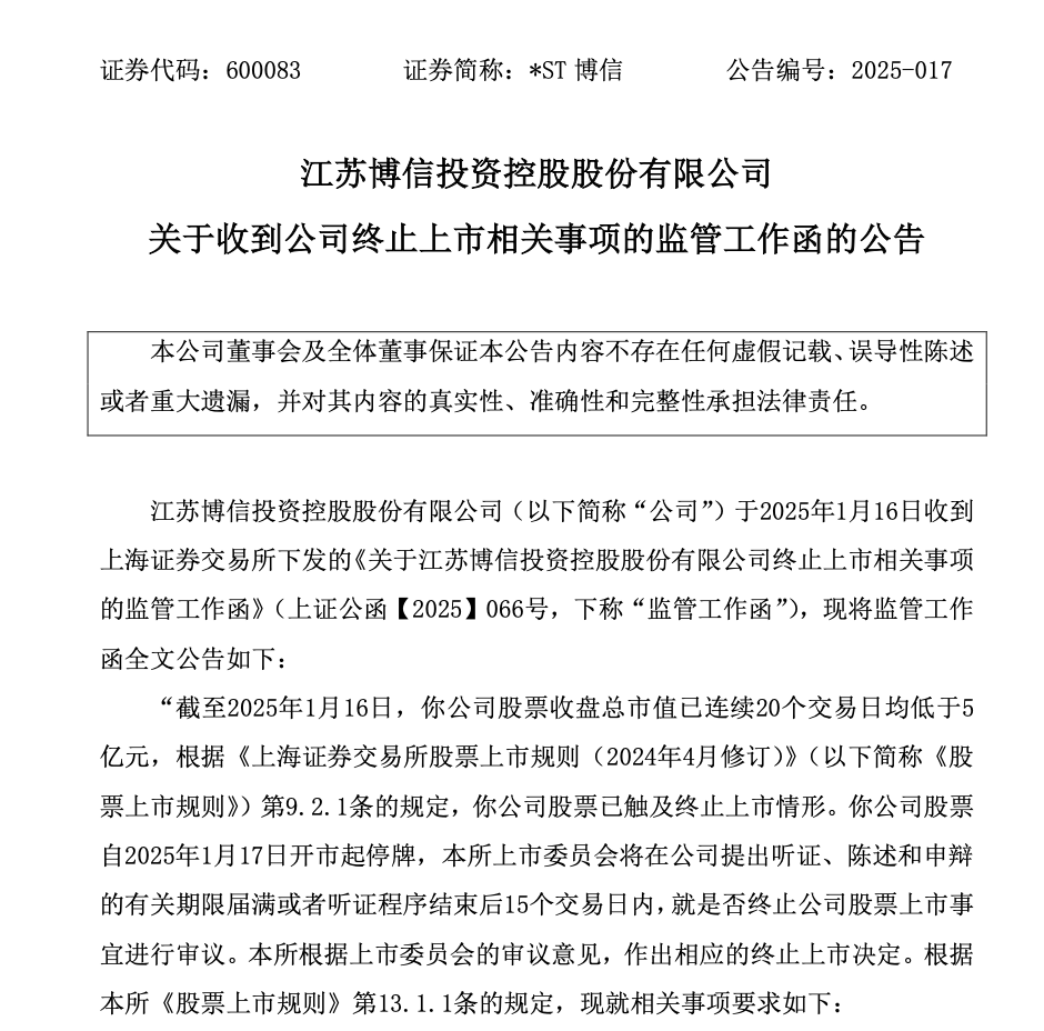 上交所还要求*ST博信及时披露并充分提示风险,做好股票终止上市的有关工作,并维护公司正常生产经营活动,保护公司和全体股东利益。