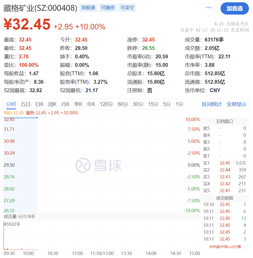近期,多家企业发布人形机器人最新进展。1月16日晚间,宇树机器人发布人形机器人Unitree G1的行走、奔跑视频。据介绍,该机器人进行了仿生、灵动升级,以实现柔顺行走和仿人奔跑。同期,软通天擎机器人公司在无锡发布了旗下首款交互与教育双足机器人天鹤C1,定位科研教育和交互服务场景。 1月14日,在北京市第十六届人民代表大会第三次会议上,北京市市长殷勇作政府工作报告。谈及2025年重点任务,报告提出,强化应用场景牵引,加快商业星座组网等试点示范,举办世界人形机器人运动会。 东吴证券研报认为,现阶段人形机器人行业内加强合作已成主流趋势,机器人本体企业拥有更好的技术研究平台与现实落地场景。人形机器人行业产业合作大趋势已成主流,企业间合作加强有望共同助推人形机器人产业化进程加速。 藏格矿业复牌一字涨停 1月17日,藏格矿业正式复牌,在集合竞价阶段即大举涨停,股价报32.45元/股。截至发稿,藏格矿业仍保持一字涨停状态。