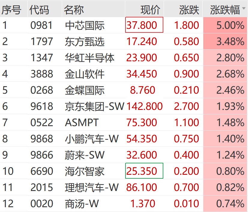 港股早间小幅低开,上午同步拉升。截至发稿,恒生指数、恒生科技指数均已翻红;中芯国际大涨5%,领涨恒生科技指数成份股。