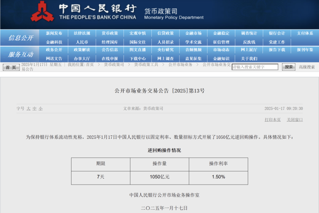 中国基金报记者 晨曦 大家好!又到周五,来一起关注上午的市场行情和最新资讯~ 1月17日,央行继续释放流动性:当日以固定利率、数量招标方式开展了1050亿元7天期逆回购操作,操作利率为1.50%。Wind数据显示,当日45亿元逆回购到期。