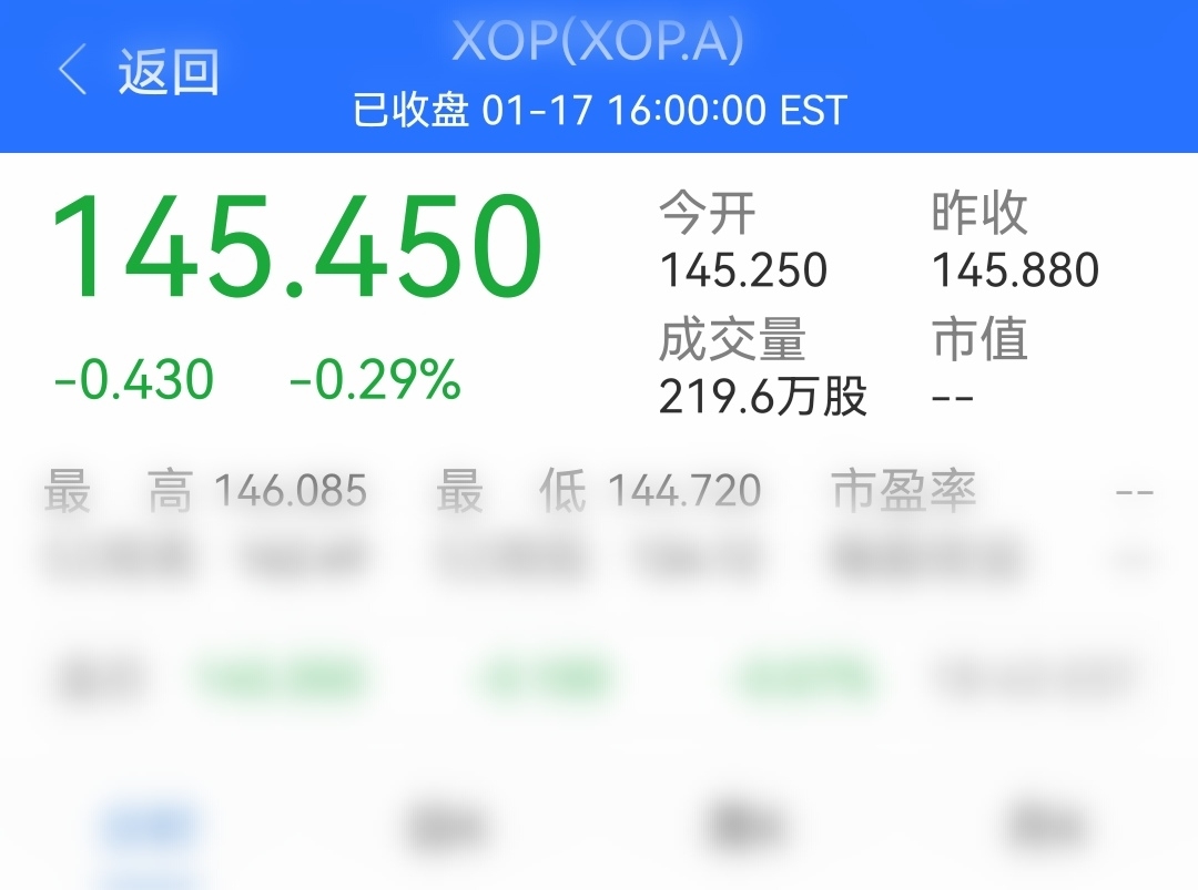 1月17日晚,SPDR标普油气开采指数EFT(XOP.A)开盘145.250,收盘145.450,-0.430,-0.29%。