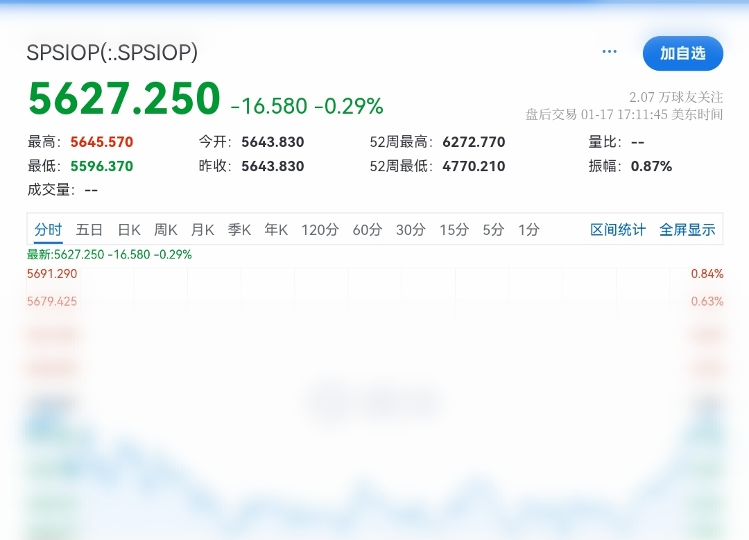 1月18日播报:1月17日晚,标普油气开采指数spsiop5627.250,-16.580,-0.29%。