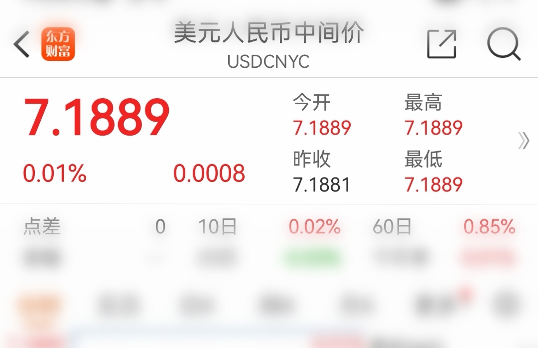 1月17日美元人民中间价7.1889,+0.01%,+0.0008。