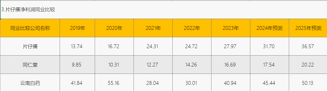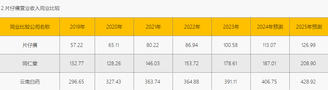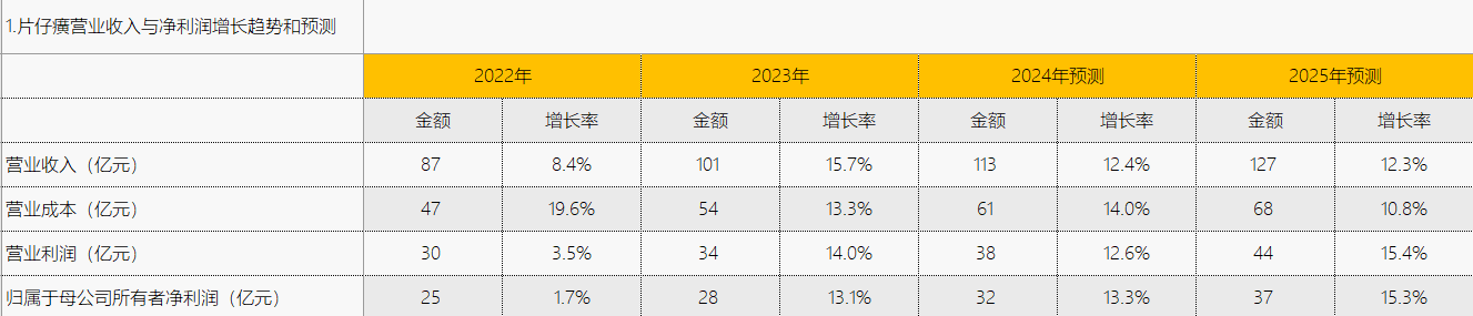 预测 2024 年片仔癀营业收入将达到 113.07 亿元,增长率为 12.41%;2025 年预计进一步增长至 126.99 亿元,增长率为 12.31%。这一预测展现了公司对未来业务发展的乐观预期,可能是基于其品牌影响力的持续扩大、产品线的不断拓展以及市场需求的稳步增长。